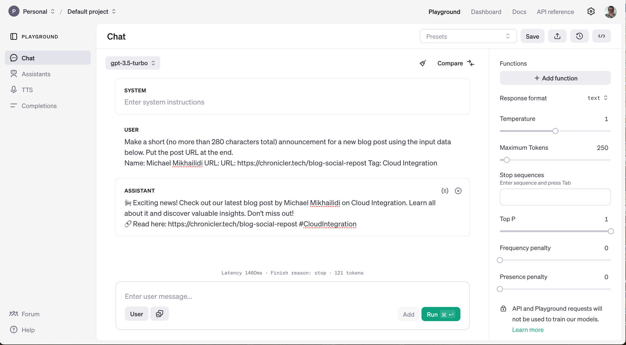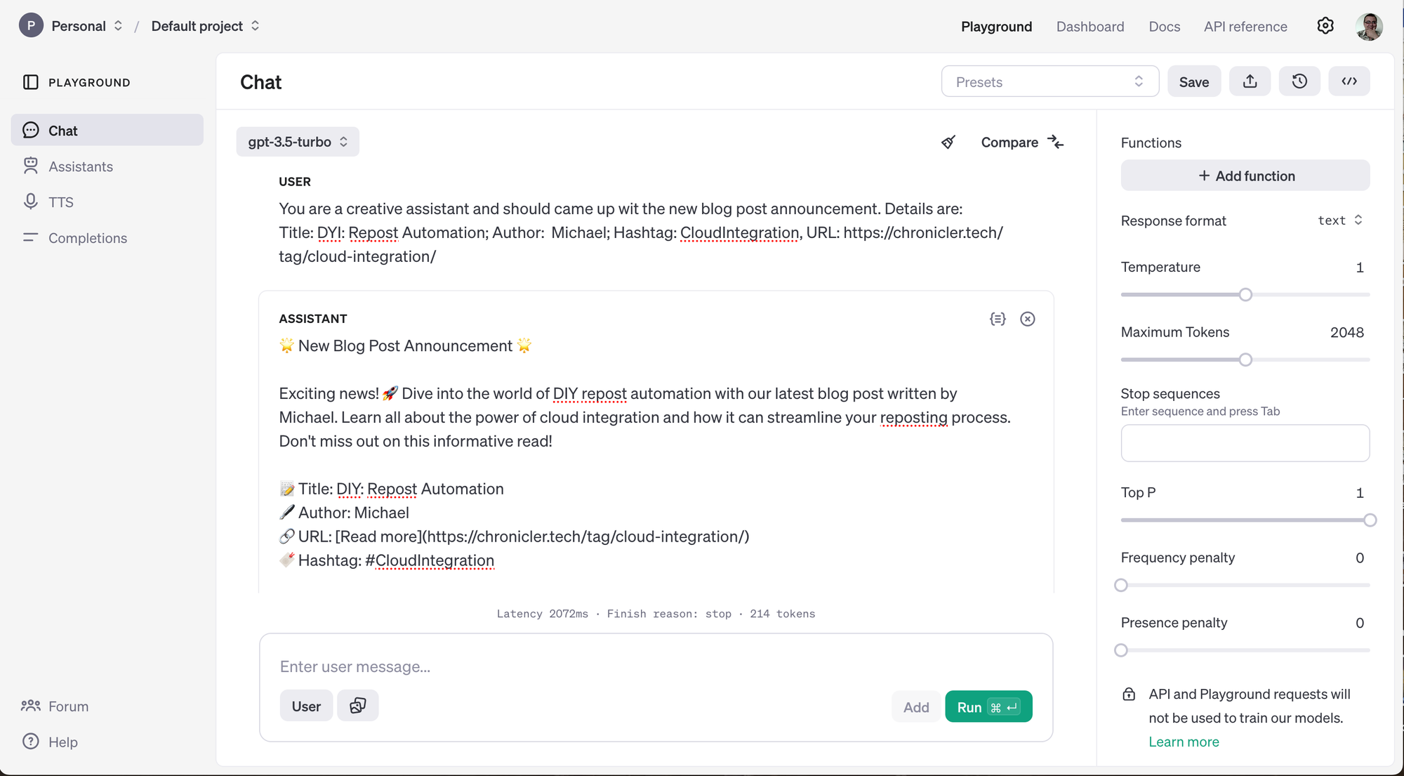 The system part of the prompt allows you to apply additional parameters and limitations outside of user interaction. We don't have system input and will not use it for prompt generation. Now, let's ask the model to generate an announcement for the first blog in this series - DYI: Repost Automation.