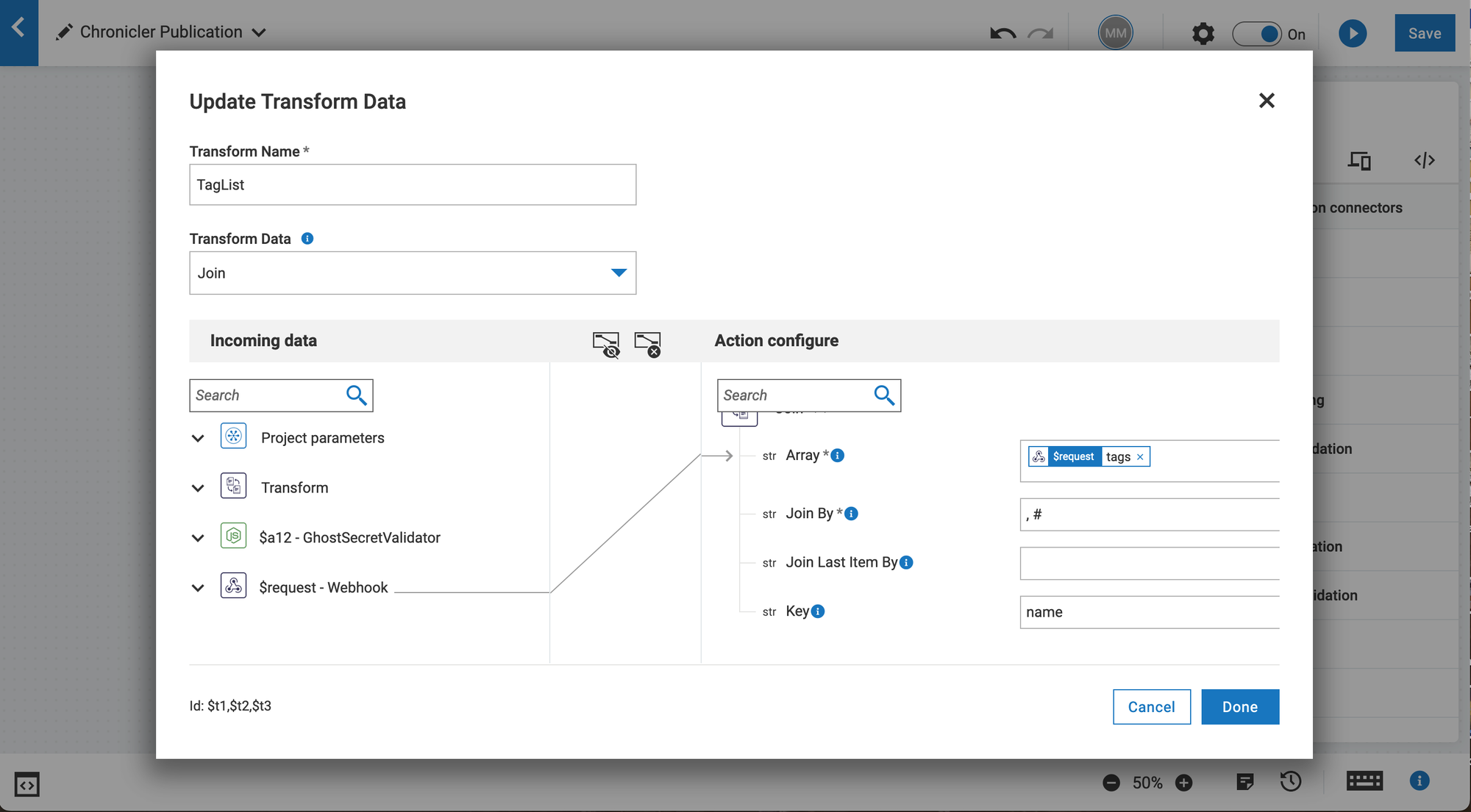 To replace template placeholders, our event has all the details except the string with the tag list. To create one, I used the Transform action for the ChatGPT connector. To generate a string with tags: