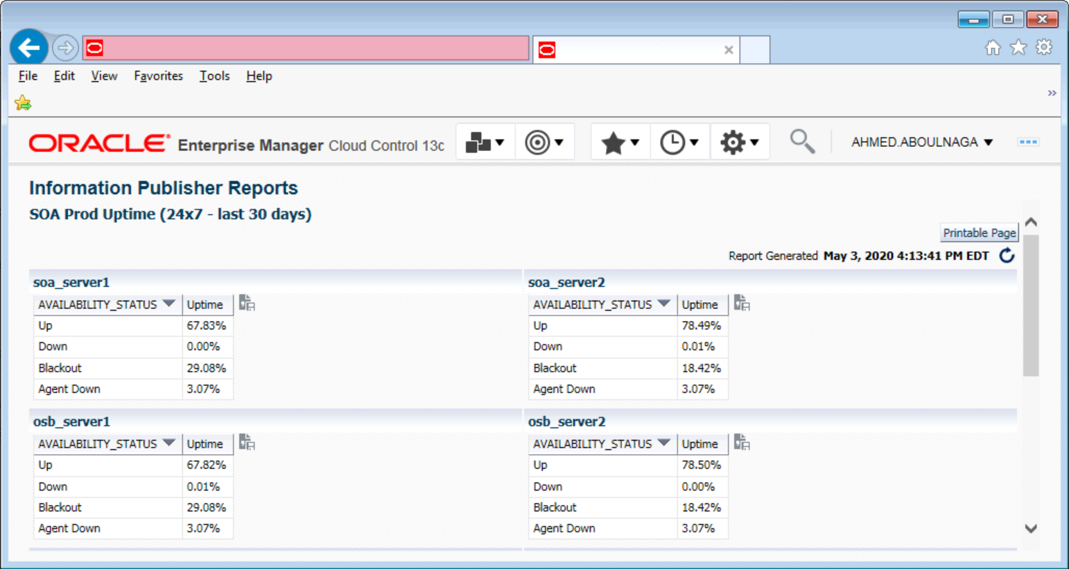 Here is my custom availability report in Oracle Enterprise Manager (OEM) 13c (using Information Publisher). It consists of multiple elements across multiple rows.